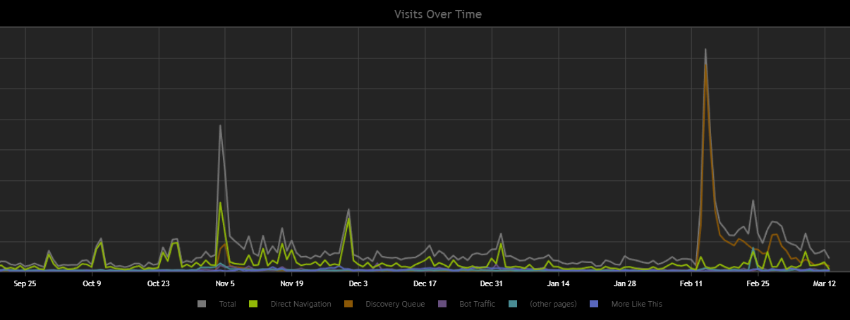 A bit less than double the total from launch day, although with more of a tail over the last month. I guess I was in the discovery queue (brown line) for launch day and then hidden again, or something. I don’t know what the other small spikes are about.